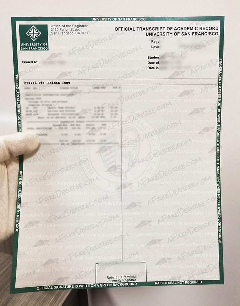 Order a fake University of San Francisco transcript, replicate the University of San Francisco transcript, apply for the USF fake transcript, and copy the USF transcript online. The University of San Francisco (USF), founded in 1855 by Jesuits, is a private Catholic university with a rich history. It ranks highly for campus diversity and value, offering over 150 academic paths including top-ranked entrepreneurship programs. Located on a hilltop in San Francisco’s heart, it blends small-class learning with access to the city’s innovation and culture.